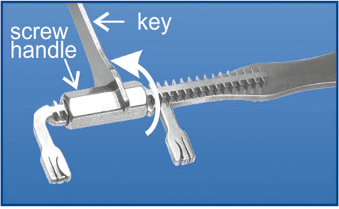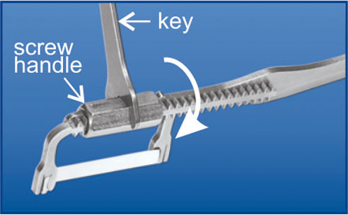 Zvoľte vhodnú vzdialenosť medzi hrotmi držiaka otáčaním držadla kľúčom, vložte prúžek do otvorov držiaka (schéma nižšie).