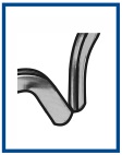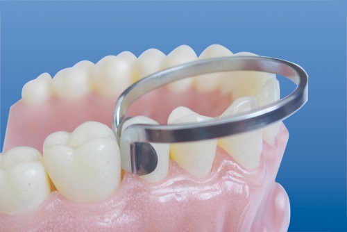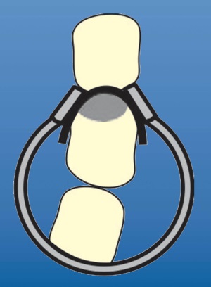 Hroty D-krúžku sú zakrivené dovnútra, aby fixovali matricu na distálnej strane zuba.
