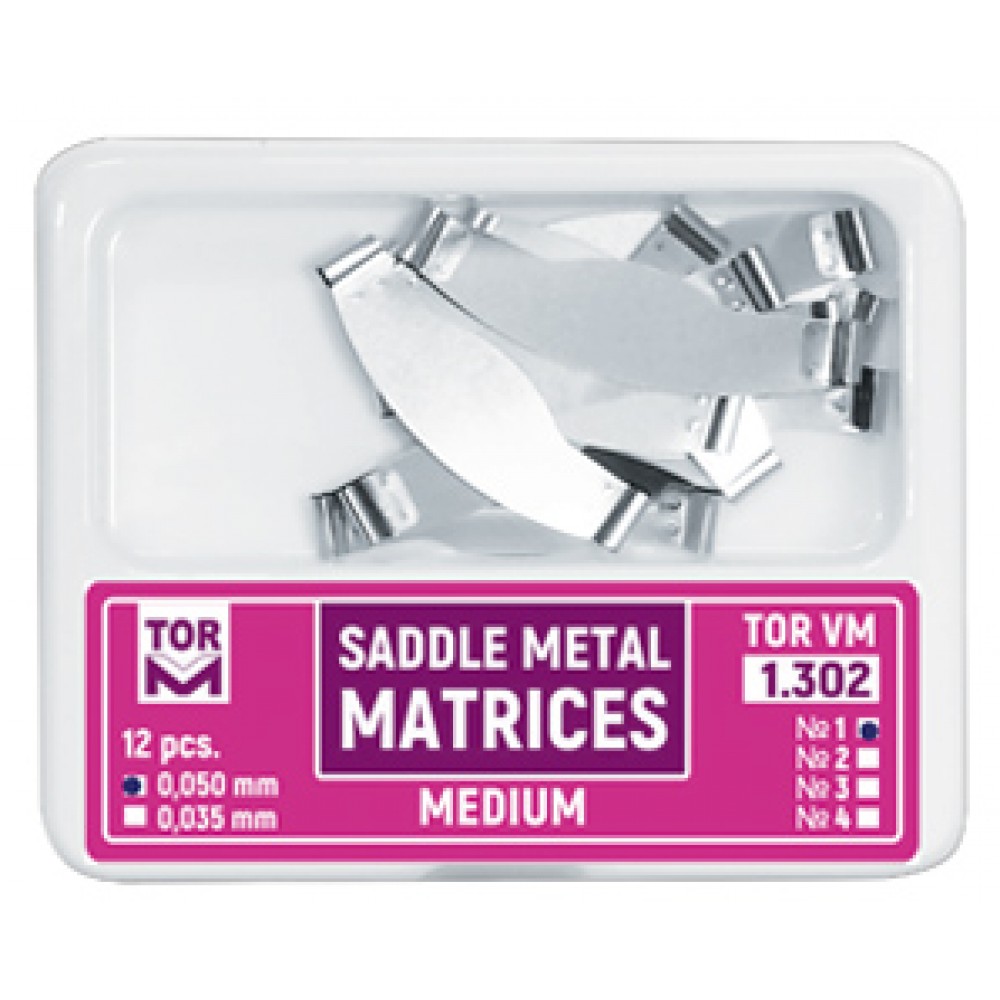 Sedlové kovové matrice stredné 1.302 (12 ks) Výrobca: TOR VM Kód dodávateľa: 1.302(1); 1.302(1); 1.302(2); 1.302(2); 1.302(3); 1.302(3) Hrany sedlových matríc sú valcového tvaru, do ktorých sa po inštalácii matrice vkladajú hroty krúžka alebo napínače. Všetky matrice sú k dispozícii v dvoch hrúbkach (0,050 mm a 0,035 mm). Existujú tri tvary matíc: tvar 1 - štandardný, tvar 2 - s nastaviteľnou stredovou časťou, tvar 3 - so zväčšenou podgingiválnou rímsou. V nižšie uvedenej ponuke zadajte typ, ktorý chcete objednať 50 ks. - + Pridať do košíka 5 € za 1 ks. Cena bez DPH: 4.07 € Select product variation tvar 1 - štandardný 12 ks, 0,035 mm tvar 1 - štandardný 12 ks, 0,050 mm tvar 2 - s nastaviteľnou stredovou časťou 12 ks., 0,035 mm tvar 2 - s nastaviteľnou stredovou časťou 12 ks., 0,050 mm tvar 3 - so zväčšenou podgingiválnou rímsou 12 ks, 0,035 mm tvar 3 - so zväčšenou podgingiválnou rímsou 12 ks, 0,050 mm