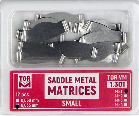 Sedlové kovové matrice malé 1.301 (12 ks) Výrobca: TOR VM Kód dodávateľa: 1.301(1); 1.301(1); 1.301(2); 1.301(2); 1.301(3); 1.301(3) Hrany sedlových matríc sú valcového tvaru, do ktorých sa po inštalácii matrice vkladajú hroty krúžka alebo napínače. Všetky matrice sú k dispozícii v dvoch hrúbkach (0,050 mm a 0,035 mm). Existujú tri tvary matíc: tvar 1 - štandardný, tvar 2 - s nastaviteľnou stredovou časťou, tvar 3 - so zväčšenou podgingiválnou rímsou. V nižšie uvedenej ponuke zadajte typ, ktorý chcete objednať. 47 ks. - + Pridať do košíka 5 € za 1 ks. Cena bez DPH: 4.07 € Select product variation tvar 1 - štandardný, 12 ks. 0,035 mm tvar 1 - štandardný, 12 ks. 0,050 mm tvar 2 - s nastaviteľnou stredovou časťou 12 ks. 0,035 mm tvar 2 - s nastaviteľnou stredovou časťou 12 ks. 0,050 mm tvar 3 - so zväčšenou podgingiválnou rímsou 12 ks. 0,035 mm tvar 3 - so zväčšenou podgingiválnou rímsou 12 ks. 0,050 mm